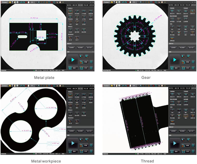 VisionX software provides up to 80 extraction analysis tools, including [Feature Extraction] (such as maximum points, centerlines, arcs, peaks, etc.), [Accessory Tools] (such as any dot & line & circle, fitted straight line, Fit circle, tangent, inscribed circle, etc.), [Smart Labeling], [shape tolerance] , special [Application Tool] (such as pitch distance, pitch angle, slot, thread, round cross, down Angle, rounded corners, etc.)